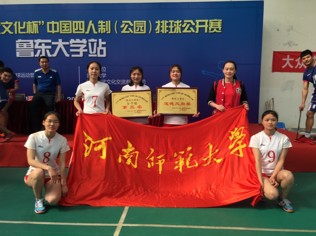 2017年4月29日,中国四人制(公园)排球公开赛在山东省烟台市鲁东大学举行,此次比赛由国家体育总局排球运动管理中心主办,由鲁东大学、烟台精武文化交流有限公司承办。我校代表队在教练郭雯靖的带领下参加了乙组女子比赛。经过运动员们的顽强拼搏、激烈比拼,我校最后取得第三名的好成绩。同时还荣获道德风尚奖。此次比赛不仅加强了各地方学校之间的交流与沟通,而且体现了运动员们奋勇拼搏,不轻放弃的精神,同时也充分展示出运动员们良好的竞技水平,更好的诠释了体育精神。