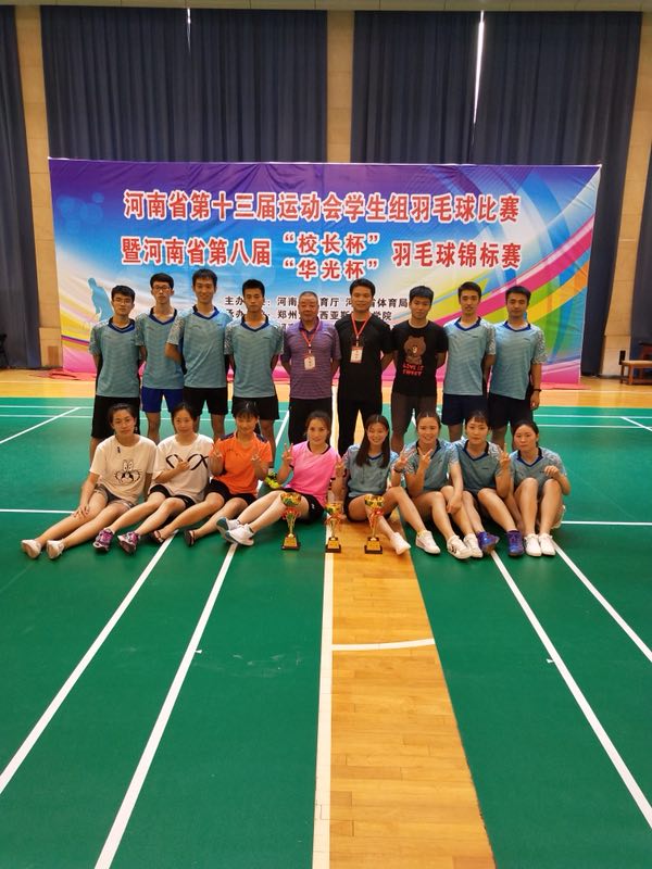 7月7日-14日,由河南省教育厅、河南省体育局主办的2018年河南省第十三届运动会学生组羽毛球比赛暨河南省大学生“华光”体育活动第八届羽毛球锦标赛在郑州大学西亚斯国际学院举行。本次比赛分为甲组(普通大学生组)和乙组(体育学院组),共有47所高校540名运动员参加,参赛单位和人数创历史新高。我校代表队共取得2金2银,两个第4,两个第6,一个第7名和第8的优异成绩,是我校参赛以来在该项赛事上取得的最好成绩。