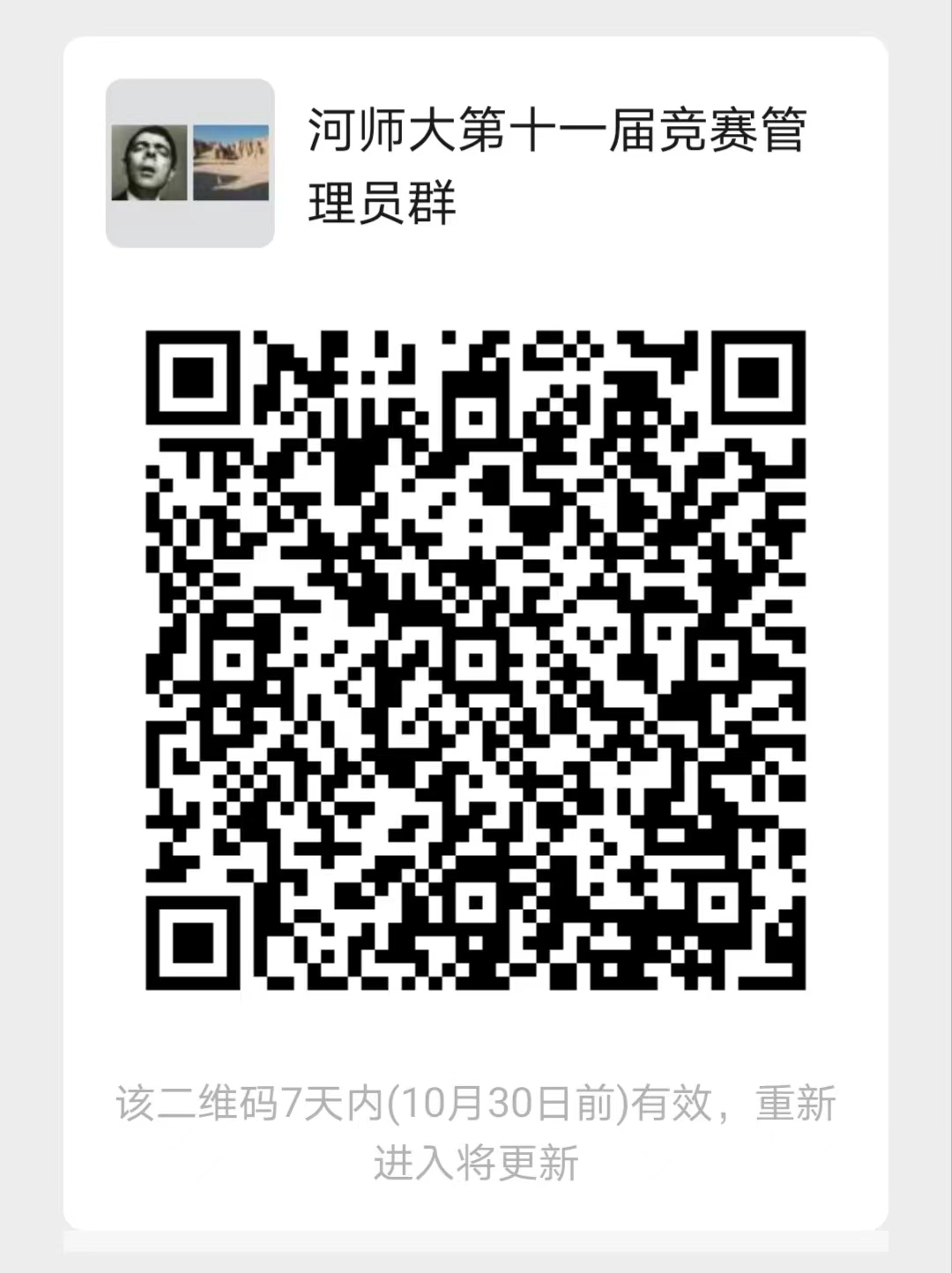 2.制定方案,明确责任。各单位要细化本单位组织学生参加竞赛活动的具体方案,明确工作目标,加强组织引领,充分发挥辅导员宣传发动、督促落实作用,发动学生广泛参与学习和答题。在活动期间要明确专人担任管理员,负责学生基本信息上传、账号密码下发、密码重置、成绩查询等工作。扫描二维码加入管理员微信群(见附件)。