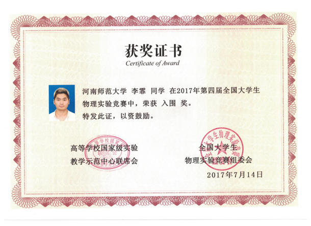 经过激烈的角逐,我校物理与材料与科学学院2015级光电信息科学与工程专业孙永强同学、物理学专业张婉婷同学在全国综合实验组排名第11名优异成绩荣获三等奖,2015级物理学专业李宁馨、李霏同学分别以第4041名的成绩获得入围奖,提升了我校及物理学专业的影响力和知名度。此次竞赛的指导教师为我校国家级物理实验教学示范中心的毕小群、尚军老师。