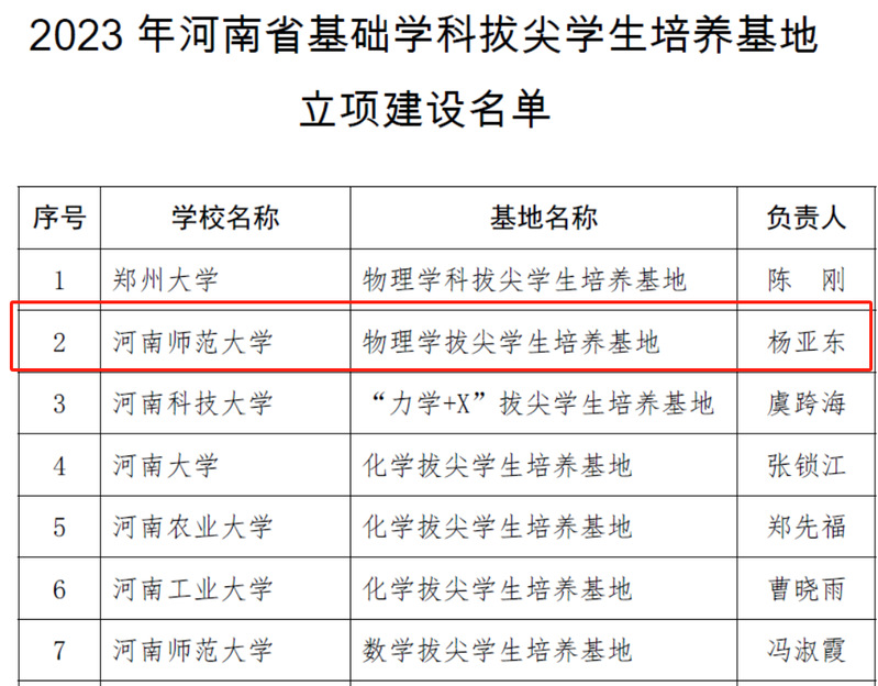 近日,河南省教育厅发布了《关于2023年河南省基础学科拔尖学生培养基地立项建设名单的公示》,我院杨亚东教授负责的物理学拔尖学生培养基地获批立项建设。