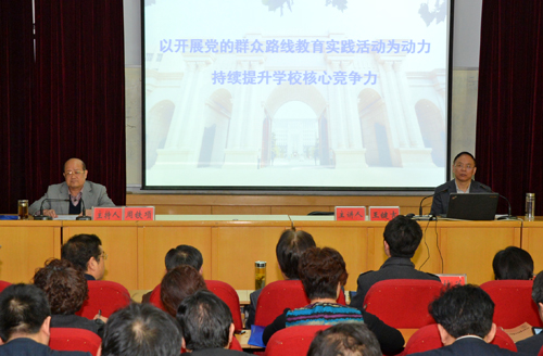 王校长强调,高效管理是提升大学核心竞争力的机制保障,首先要确立“一切服务于人才培养和学术进步”的管理理念。其次要完善管理体制机制。一要正确处理学术管理和行政管理之间的关系。二要分层管理,责权明确。要通过深入开展党的群众路线教育实践活动,进一步提高领导干部思想认识,增强宗旨意识,强化危机意识、忧患意识、责任意识、机遇意识;倡导敢干、实干的工作作风,克服工作中存在的宗旨意识淡薄、作风不实的现象;以教育实践活动的实际成效取信于广大师生,用作风建设的成效汇聚起推进学校改革发展的强大力量。三要专业分工,互相配合。要通过深入开展党的群众路线教育实践活动,教育引导党员干部敢于担当,真心对广大师生负责,热心为师生办好事、办实事,诚心接受群众监督。四要纪律严明,令行禁止。要通过教育实践活动,教育引导干部深入实际、深入师生,接地气、通下情;在工作中坚持民主集中制,虚心向广大师生学习,提高决策的科学性和工作计划性;加强督促检查,保证工作落实,切实提高干部的执行力,确保工作的实效性。五要有章可循,有章必循,实现行政管理的制度化、规范化和程序化。通过教育实践活动,引导广大干部敢于坚持原则,勇于接受师生监督;要对贯彻党的群众路线方面的制度进行梳理,经实践检验行之有效、师生认可的,长期坚持,抓好落实;对不适应新形势新任务要求的,抓紧修订完善,建立长效机制。
