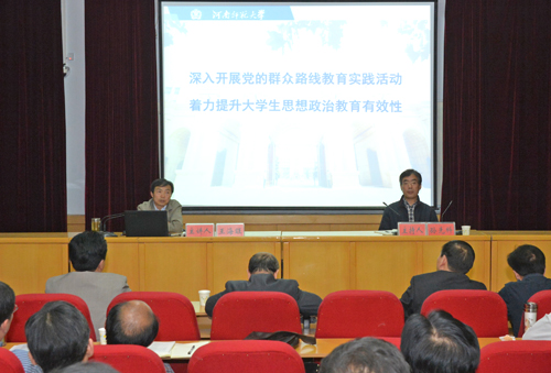 王海旺副书记在报告中指出,开展党的群众路线教育实践活动有助于牢固确立以学生为本的理念,有助于解决学生反映强烈的突出问题,有助于改进作风,贴近学生,提高思想政治教育有效性。他强调,我校大学生的思想政治状况主流持续呈现积极、健康向上的态势,但也存在许多需要关注的问题,表现在部分学生入党动机不纯,培育和践行社会主义核心价值观有待加强,学校和家庭教育互动不够,大学生宗教信仰问题值得关注,大学生对辅导员作用的发挥和素质提出更高的要求,大学生心理压力来源和倾诉渠道需要认真关注,网络对大学生思想政治教育的影响越来越大,部分学生上网时间过长等。