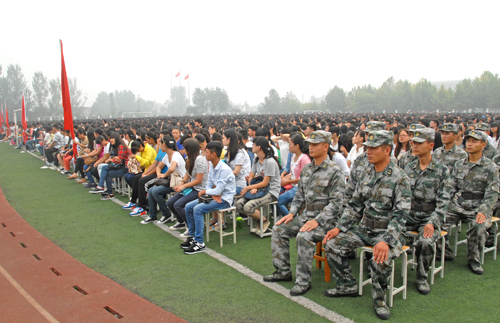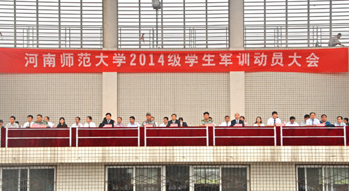 9月8日上午,我校2014级学生军训动员大会在校塑胶体育场举行。中国人民解放军新乡军分区牧野区人民武装部政委文绪华上校,中国人民解放军71697部队于成立上尉,我校党委副书记王海旺,副校长徐存拴等领导出席动员会。学生处、教务处、校团委等相关部门负责人及各学院领导、71697部队全体帮训教官、各学院新生辅导员和军训新生参加动员大会。大会由我校国防教育教研室主任、武装部部长王庆国主持。