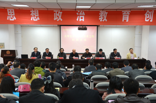 11月11日,我校大学生思想政治教育工作创新论坛在勤政楼第四会议室举行。校党委书记周铁项、校党委副书记王海旺、河南教育(高校版)主编高扬出席开幕式,组织部、宣传部、就业指导服务中心、校团委等相关职能部门负责人、学生处全体工作人员、各学院党委(总支)副书记和全体专兼职辅导员参加开幕式。开幕式由校党委学工部部长、学生处处长张向战主持。