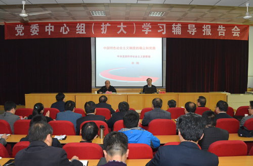 11月21 日上午,校党委中心组(扩大)学习在新五五四教学楼党校教室举行。中央党校科学社会主义教研部常务副主任秦刚教授以《中国特色社会主义制度的确立与完善》为题做了专题辅导报告。报告会由校党委书记周铁项主持。校党委副书记王海旺,党委副书记、纪委书记王新生,副校长黑建敏、李雪山出席报告会。学校副处级以上领导干部、相关学院师生代表参加了会议。