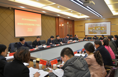 3月11日上午,2015年河南省高校师生思想政治状况滚动调查暨高校形势与政策教材建设调研工作会议在我校勤政楼第三会议室召开。河南省教育厅思想政治工作处处长何秀敏,校党委书记郑邦山、副书记王海旺出席会议。来自省内15所高校的党委宣传部部长和学工部(处)长参加了会议。会议由我校党委学工部部(处)长张向战主持。
