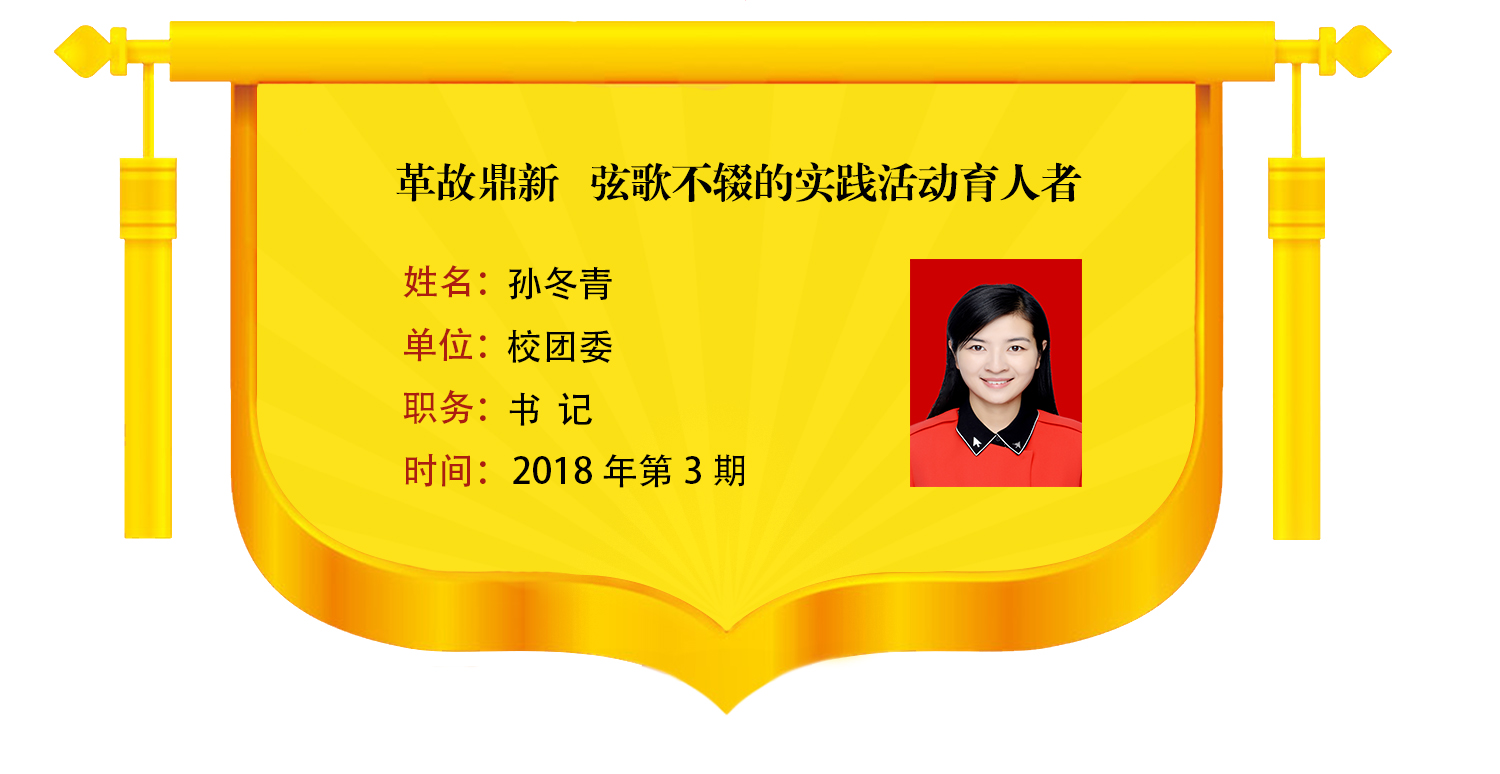 孙冬青老师是共青团第十八次全国代表大会代表,共青团河南省第十四届委员会委员,河南省模范团干部。她对教育事业满怀热忱,对育人工作心存敬畏。责任在肩,她将每一份工作都做到极致;使命在心,她将每一种角色都演绎完美。她秉承“青春聚心、青春聚梦、青春聚爱、青春聚力”工作理念,团结带领广大青年听党、信党、跟党走,下力办好“未来学院”,构建青马工程培训体系,每年培训青马学员近千人。她坚持活动牵引,引领校园风尚,常态化开展群众性文化活动,五四主题歌会、人文讲坛、草地音乐会、师大雄风球类赛、健美操赛深受学生欢迎。她注重实践育人,创新开展暑期“三下乡”“我是师大代言人”“小时光”公益课堂、“共青团文明路”等社会实践活动,率领师大学子在广阔天地增长才干,学校连续多年荣获全国社会实践工作先进单位,多支团队荣获全国优秀团队。