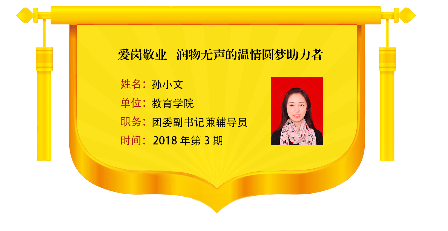 孙小文老师感恩母校培养,热爱师大校园,钟情学生工作,研究生毕业后毅然选择留校担任辅导员至今。6年职业生涯,2100个日日夜夜,她坚持以德为基、志在育人的理念,恪守踏实工作、认真负责的准则,立足岗位默默耕耘,服务引导学生逐步成长,陪伴千余学生顺利毕业,助力莘莘学子师大圆梦,诠释了一名普通教育工作者平凡中的伟大。她尊重职业,在岗必尽责,坚信学生身上无小事,认真细致的处理每一件工作,当好学生的知心人。她积极探索,创办“心晴驿站”心理健康工作站,开通“心晴热线”,为学生们答疑释惑;举办教育学院“教育文化节”,为学生搭建展示平台;成立“石榴籽”辅导员工作室,组织政工干部学习维吾尔族语言,拉近与维吾尔族学生的距离;加强管理研究,探索贴近当代青年学生的管理方法,总结的“轻有力”管理模式被评为高校学生党建工作创新应用研究项目。