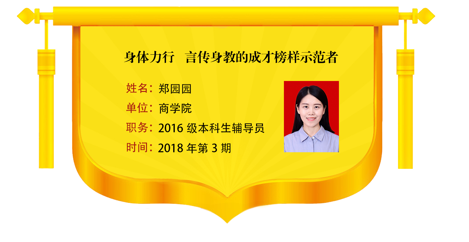 郑园园,女,汉族,河南汤阴人,1987年4月生,中共党员,2014年参加工作,2017年任商学院2016级本科生辅导员、2016级本科生党支部书记。