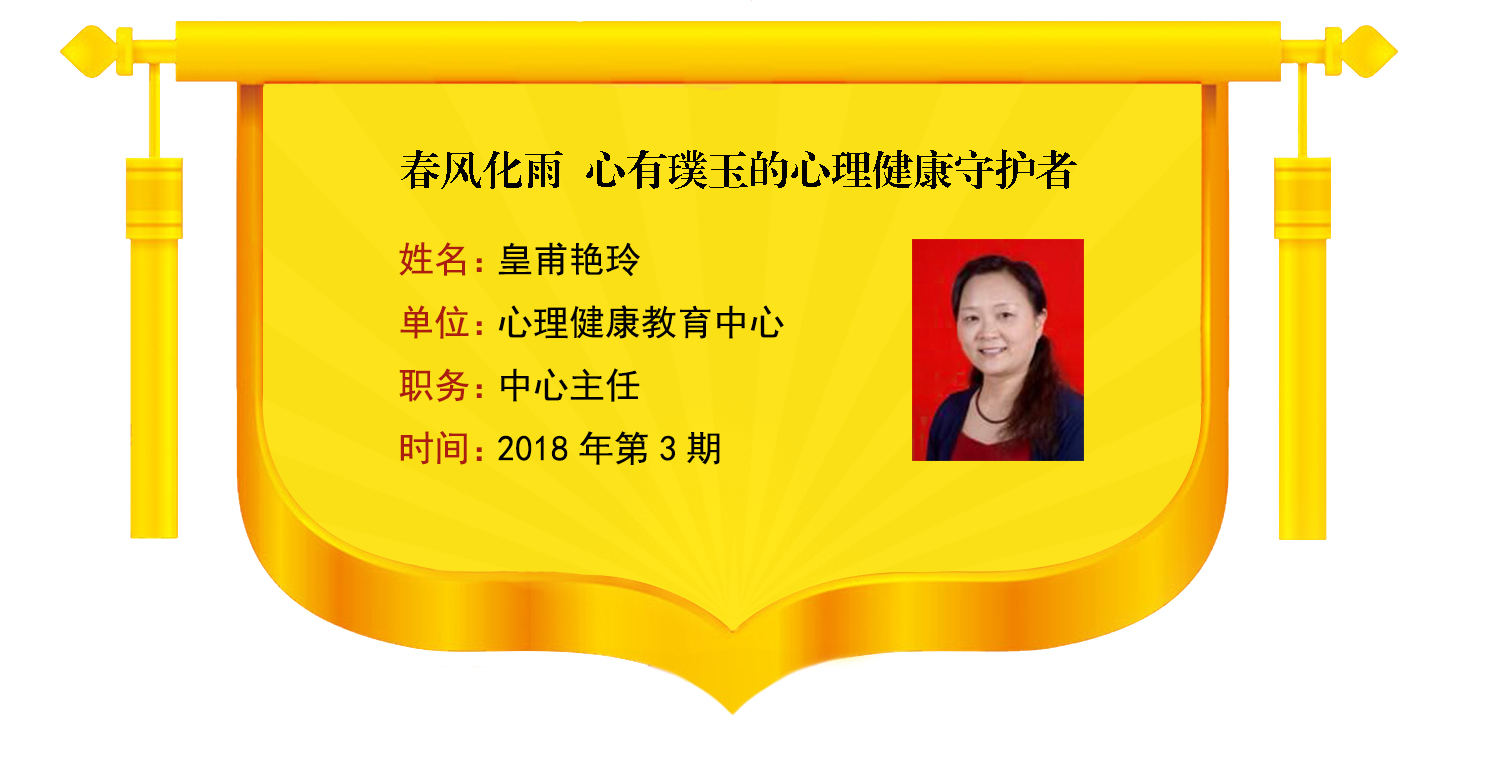 皇甫艳玲老师深具学生情缘,把为学生服务作为终生事业,始终奋战在学生工作第一线,先后从事大学生思想教育、学生管理、心理健康教育等工作。28年的摸爬滚打和辛勤付出,历练出灵活的工作方法、丰富的实践经验、干练的处事作风、出色的应变能力和高尚的道德情操。她视野开阔、善于创新。在学生处工作期间,1995年首次组织“大学生基本技能竞赛”,并连续参与组织20余届,有效提高大学生综合素质,该活动已成长为学校教育的特色品牌。她春风化雨、润心育人。2005年成功举办“第一届大学生心理健康宣传月”,此后每年一届,每届一个主题;定期举办润心讲堂,创建心灵绿洲公众号,年均个体咨询学生600多人次、危机干预50余起、累计服务学生数万人,有效呵护学生心理健康。她柔情侠骨,铁肩道义。2016年5月,刚就任独立后的中心主任,便迎来省高校心理健康教育试点单位评估,她带领娘子军团队不分昼夜高效运转,在10月份接受评估时获得一致好评。2017年11月中心成功获批河南省高校首批心理健康教育示范单位。