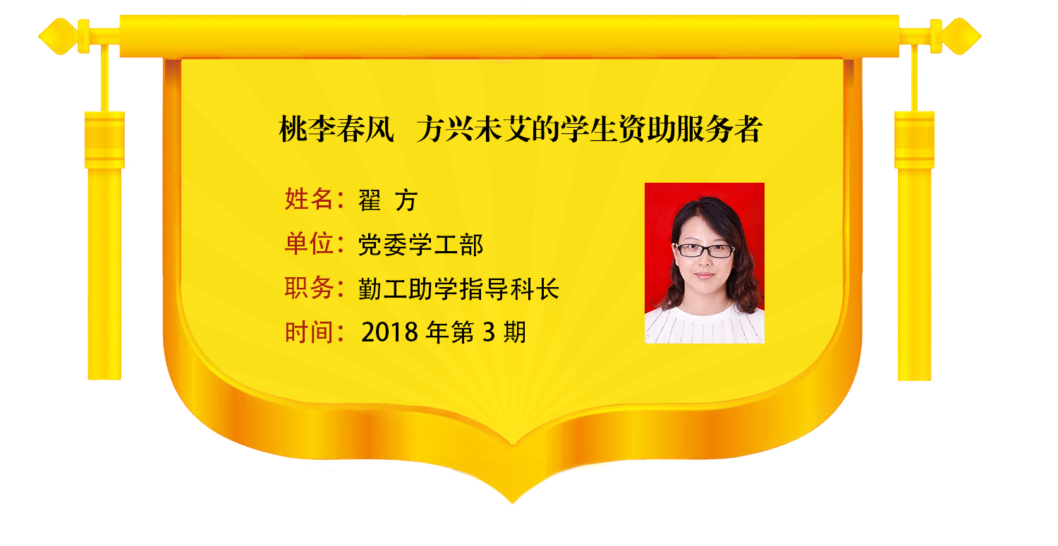 翟方老师入职后一直战斗在学生资助工作一线,在平凡的岗位上,默默地奉献着汗水和爱心,每年都圆满完成近万名家庭困难学生的资助工作。学生事务无小事,她始终坚持资助和育人相结合,带着“温度”工作,努力培养青年学生自立自强、知恩感恩的良好品质。通过“榜样师大”表彰,挖掘了一批国家奖学金和励志奖学金优秀学生典型;通过“应善良助学金”获得者暑期实践,传播“应善良基金会”的益行善举,锤炼了广大学子的教学和实践能力;通过“情暖夕阳 爱满人间”活动,带领志愿者照顾我校85岁以上老教师,让所有参与者都收获了责任和感恩;通过与河南省慈善总会接洽,尽力争取困难学生大病救助帮扶政策,减轻学生家庭负担……她经常献计献策,创新性的开展工作,2017年暑假,出台完善我校多项资助文件,更加科学规范了资助政策的精准实施和资助资金的精准发放。我校多次荣获省资助工作 “优秀单位”“先进集体”,翟方老师被评为“河南省学生资助工作先进个人”。
