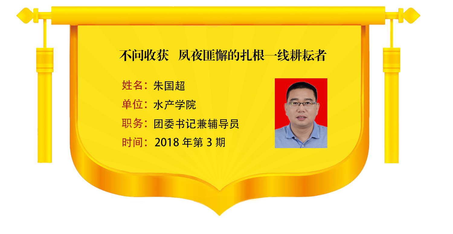 朱国超老师一直坚守在辅导员岗位上,十三载耕耘,十三年坚守,只为心中那份热爱。作为辅导员,他将教育、管理和服务学生相结合,将“老师退半步、学生进一步”相结合,将思想政治教育与解决学生实际问题相结合;他主动学习、注重积累、勤动脑筋、思路开阔、勇于尝试,在思想政治教育、党建、团学工作等方面都有深入思考和作为。作为学院本科生党支部书记,紧密结合大学生党员的特点和水产学院专业教学的特殊性,在学生外出实习期间成立流动党支部,加强流动党员管理,其所带党支部被评为2017年河南省高校先进基层党组织,《水产学院学生党员生产实习流动党支部》也被评为2017年伟德官网下载苹果版基层党建创新项目。作为学院团委书记,在实践育人方面,朱国超老师组织实施的“‘渔业惠农’助力脱贫攻坚志愿服务项目”获得团中央2017年“千校千项”成果遴选最具影响力项目。