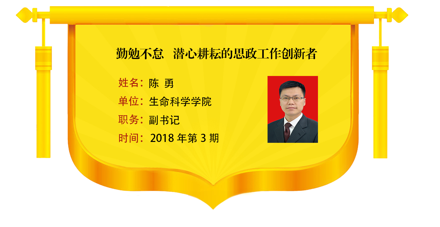 陈勇,男,汉族,河南济源人,1978年5月出生,中共党员,2001年7月参加工作,现任生命科学学院党委副书记。