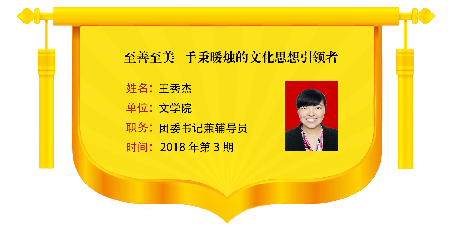 王秀杰老师是河南省优秀辅导员,河南省文明教师,8年辅导员之路,始终坚持用先进思想引领人,把思政教育摆在首位,成立文学院“团团驿站”,打造“靠谱的朋友圈”“有趣的俱乐部”。她始终坚持用先进文化熏陶人,创办“秀杰读书会”, 会员超过600人,定期组织阅读分享、邀请名家解读、讨论文化热点,同步推出微信公众号,累计浏览量超过万余人次。她始终坚持用先进方式培养人,积极探索党团班三位一体协同发展模式,以学生党支部为核心,以团支部为主导力量,以班委会为主要执行机构,充分发挥“党建带团建,团建带班建”的合力作用,全面激活基层活力,实现“1+1+1>3”。她始终坚持用先进典型激励人,注重挖掘、培养、选树身边榜样,所带学生刘改月先进事迹被多家媒体报道,所带班级多次荣获河南省先进班集体, “刘改月爱心支教服务团”2次被团中央授予“全国优秀团队”,“非物质文化遗产保护调研服务队”被评为“青春爱唱响”大学生社会实践“全国优秀团队”。文学院团委被评为“河南省五四红旗团委”。