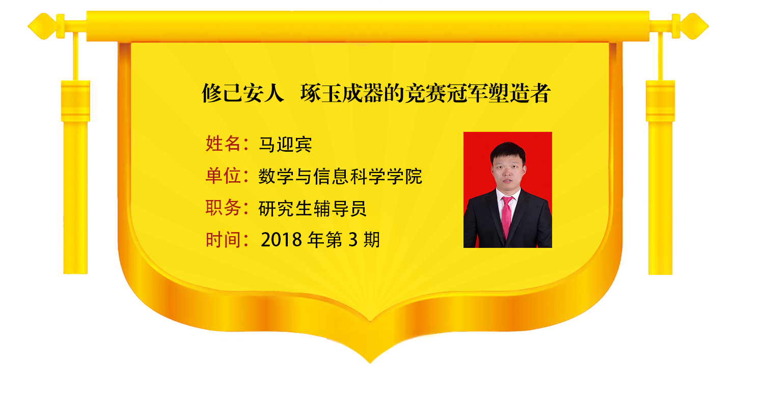 马迎宾老师工作上兢兢业业,任劳任怨,认真负责,努力在创新工作机制上下功夫,在拓宽教育途径上下功夫,在探索新的载体上下功夫,把思想政治工作与学生工作实际有机结合起来,提高思想政治工作的针对性和实效性。他所带的研究生取得喜人成绩。在2017年“华为杯”第十四届全国研究生数学建模竞赛中,我校共获得一等奖1项、二等奖2项、三等奖4项,他所负责的数学与信息科学学院研究生荣获其中4项奖励且包揽一、二等奖,创造了该院参赛以来的最好成绩。所带的2018届硕士毕业生在考博和就业方面均取得了优异成绩,其中17人参加博士研究生考试,14人被国内重点大学录取,考博成功率高达82.35%,创造了该院硕士研究生考博成功率及人数历史的新高;所带应届毕业生中考取国家公务员和飞行员各1人,银行3人,还有20余人在重点中学从事教师工作。
