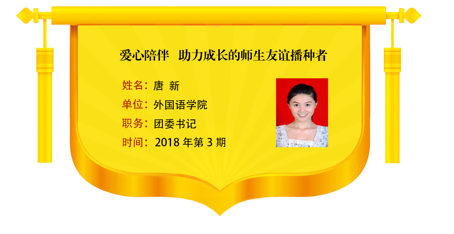 唐新老师是2018年第十届全国辅导员年度入围人物,河南省表彰的优秀辅导员。5年来,她坚守立德树人使命,勇于开拓创新,用爱心陪伴成长,用行动带领前行。只要肩上有责、腹中有墨、心中有爱,学生才会脚下有路,这是唐新老师对辅导员工作的深情感悟,也是对自己的不懈要求。她努力提高自身素质,不断总结学生工作规律,探索形成了“以加强学风建设为核心、以强化素质教育为重点、以制度建设为保障、以学生全面发展为目标”的育人模式,带领班级参加全国大学生创新项目立项79项;创建“唐新乐吧”工作室,为学生建立心灵港湾,以爱心之力辅学生成长之路;举办“外语+智库”专业学习活动,提高学生专业水平,以责任之心导学生成才之路;建立“e家人”网络直播间,为学生搭建网络沟通平台,以创新之举圆学生青春之梦。她边疆两心相系,乐吧一方情深,开展“疆心比心·情系师大”民族团结特色活动,服务保障维吾尔族学生求学成长之路。