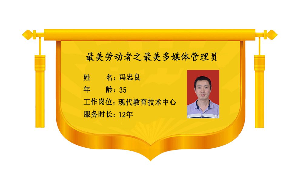自2007年入职以来,冯忠良忠于职守,无私奉献,一直坚守在多媒体教学管理岗位上。在日常多媒体教学管理服务中,他勤勤恳恳、任劳任怨,总在第一时间出现为师生解决教学中出现的各种问题。4000多个日日夜夜,72套管理设备,310间考场监管,各个楼层走廊里都留下了他巡视检查的脚步声,百余间教室内都能看见他整修机器的身影。