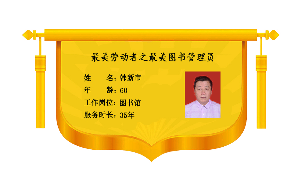 韩新市,男,汉族,河南滑县人,1959年2月生,现任图书馆流通阅览部图书管理员。