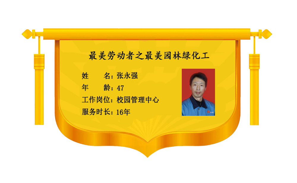 自2003年4月入职,张永强兢兢业业,任劳任怨,默默工作,在平凡的岗位上发挥着自己的光和热。他一年四季,顶酷暑、冒严寒,种花栽树、剪枝除草、浇水施肥……106万平方米的校园里,总能看到他勤勤恳恳的身影。在春季播种,在夏季浇灌,在秋季清扫。修枝、浇水、施肥、防治病虫害,他就像照顾自己的孩子一样守护着满园的一草一木,为建设三季有花、四季常绿的美丽校园奉献着自己的青春和能量。