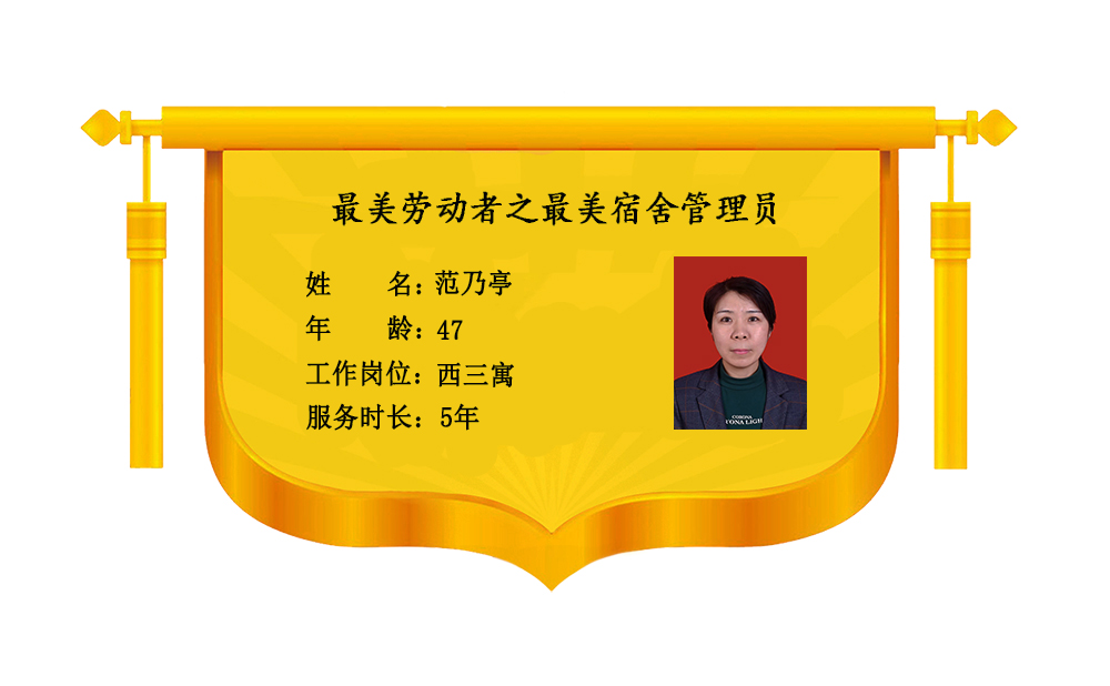 范乃亭,女,汉族,河南新乡人,1972年10月出生,现任西三寓保洁员、学生服务中心义务缝纫员。