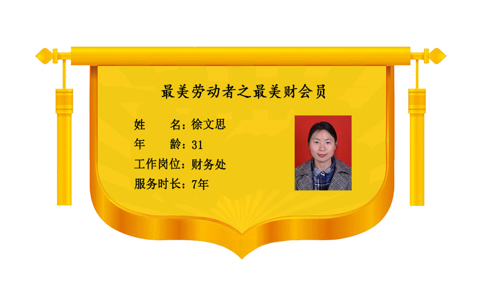 徐文思,女,汉族,河南夏邑人,1988年12月出生,现任财务处会计复核员。