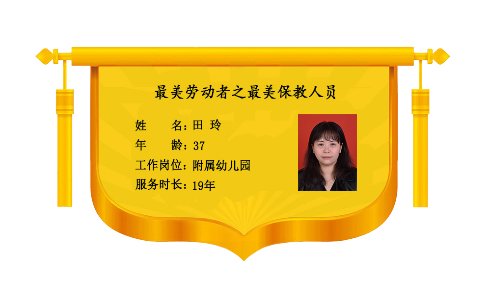 田玲自2000年6月从新乡幼儿师范毕业至今,在一线工作已有19个年头,担任过幼儿园团支部书记、小中大年级组长、班主任等职。她业务精湛、成绩斐然,爱岗敬业、有口皆碑,以园为家、乐于奉献,始终保持旺盛的创造力和火一样的激情,模范履行教师职责,将自身的能量发挥到极致,在劳动中创造属于自己的独特价值。她踏实认真的工作作风,真诚热心的做人原则得到同事及家长的一致好评。