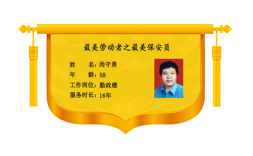 尚守勇,男,汉族,河南新乡人,1961年2月出生,系我校外聘保安,现服务于勤政楼门岗。