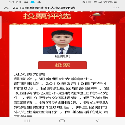 全校师生: 为在全市形成学习、崇尚、争当好人的长效机制,不断为我市精神文明建设输入新的精神力量,有力促进我市公民道德建设深入开展,新乡市委宣传部、新乡市文明办举办了“2019年度新乡好人评选活动”。我校国际教育学院程豪炎入选候选人名单。请通过微信客户端为程豪炎同学投票,为我校学子的见义勇为表示敬意。具体操作流程如下: