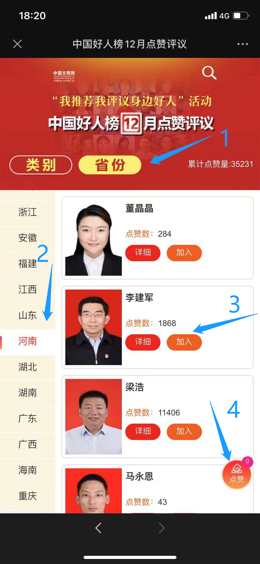 3.点赞说明:点击省份----选择“河南”----点击“加入”按钮----点击“点赞”按钮----点击“点赞评议”按钮----转发到朋友圈。