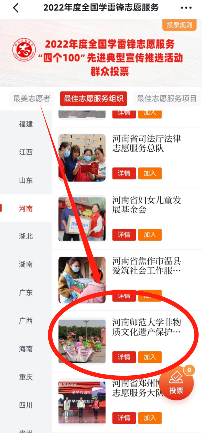 为深入学习贯彻落实党的二十大精神,积极培育和践行社会主义核心价值观,大力弘扬志愿精神,进一步健全志愿服务体系,深化拓展新时代文明实践中心建设,中共中央宣传部、中央文明办等19部门联合组织开展2022年度全国学雷锋志愿服务“四个100”先进典型宣传推选活动。我校非物质文化遗产保护协会入选“最佳志愿服务组织”推荐名单。请全校师生通过学习强国平台为我校非物质文化遗产保护协会投票,具体操作流程如下: