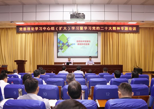 李志民以《信息技术发展与教育形态变革》为题,从人类文明发展、教育的本质属性、人工智能对教育的影响、信息技术对教育形态的改变等四个方面,详细分析了信息技术发展与教育形态变革给教育发展带来的深刻影响。他表示,技术进步是人类文明发展的根本动力,信息将成为互联网时代主导社会发展的重要因素;教育的本质属性是有目的的培养人的社会活动,应弘扬科学精神,提高人的科学素养,培养正确价值观念。他强调,人工智能技术大大提高教学效率,“互联网+教育”不断引发教育变革,教育要素正在发生深刻变化,传统大学要及时转变观念,拥抱信息技术发展带来的变化,充分发挥教育引领人类文明发展作用。报告思想深刻,内涵丰富,对我校扎实开展学习贯彻习近平新时代中国特色社会主义思想主题教育,推动学校事业高质量发展具有较强指导意义。