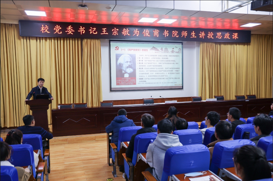 11月19日晚,校党委书记王宗敏在党校教室为俊甫书院师生讲授思政课。俊甫书院全体师生现场聆听。