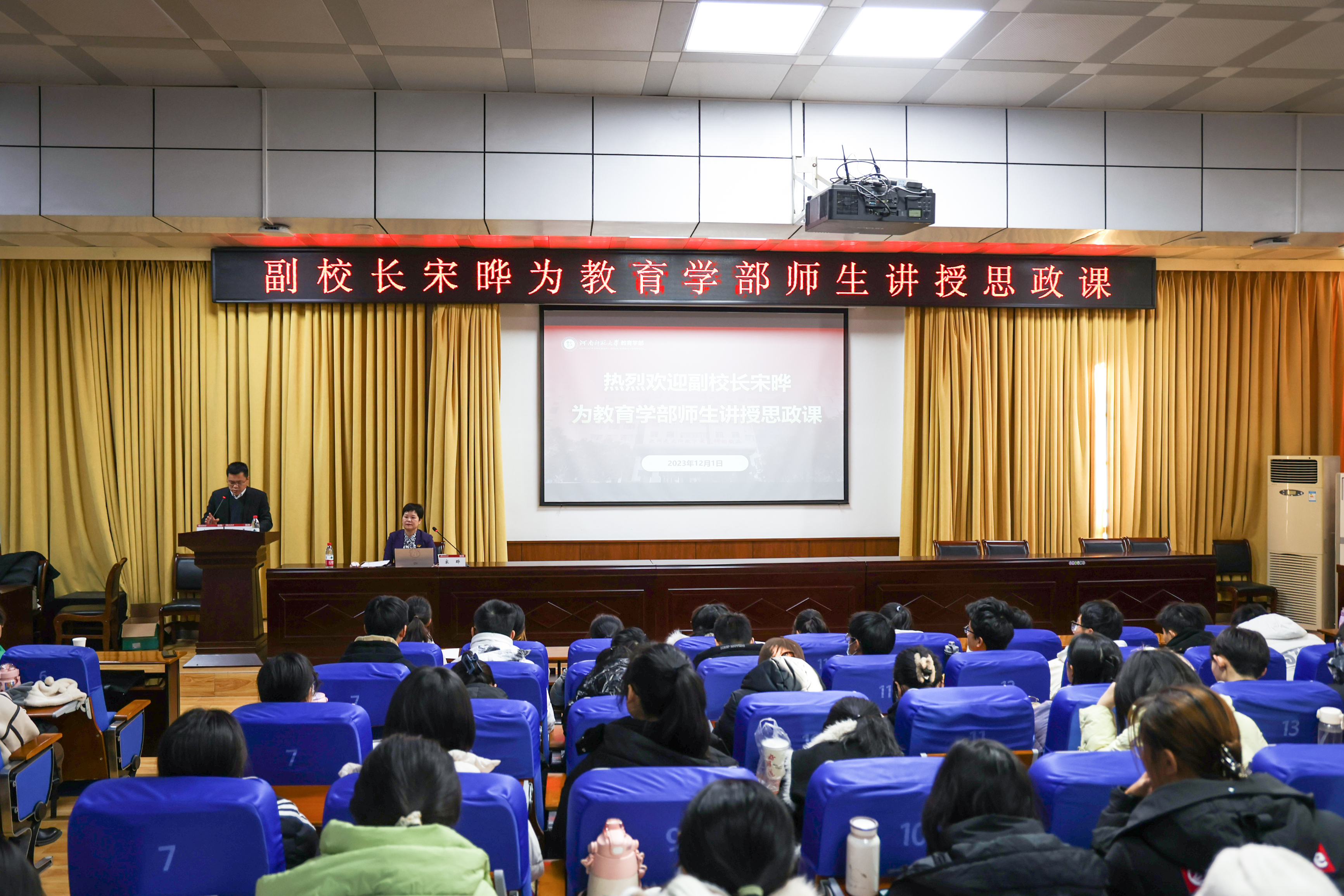 12月1日上午,副校长宋晔在新554党校教室为教育学部师生讲授思政课,教师代表和2023级全体学生参与学习。会议由教育学部党委书记陈勇主持。