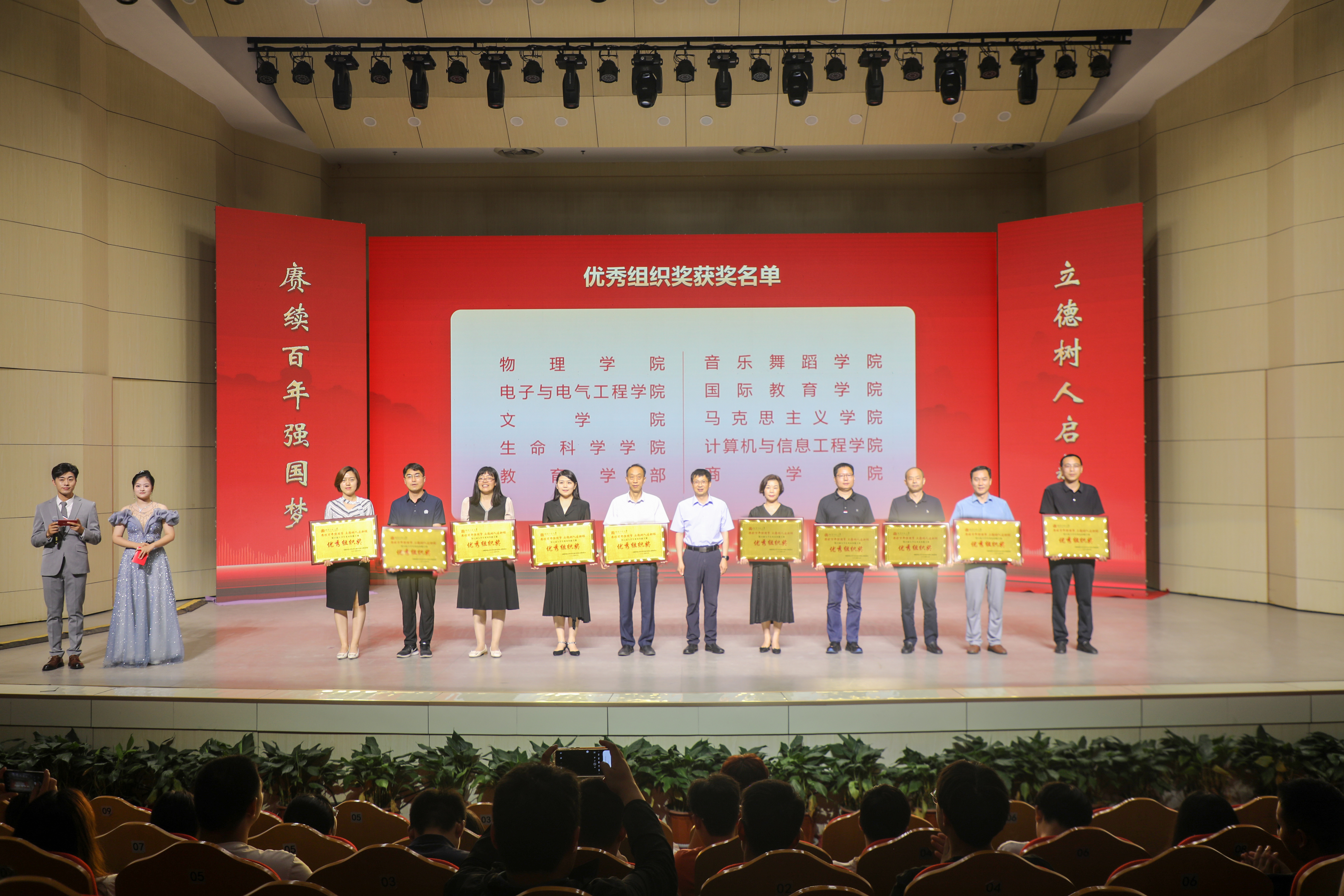 张尚字为本届大赛优秀组织奖单位颁奖,与会职能部门和活动承办单位负责人分别为获奖学生代表颁奖。音乐舞蹈学院学生表演了我校原创舞台剧《信仰的味道》,热情讴歌了共产党人对信仰的无限忠诚和执着坚守。