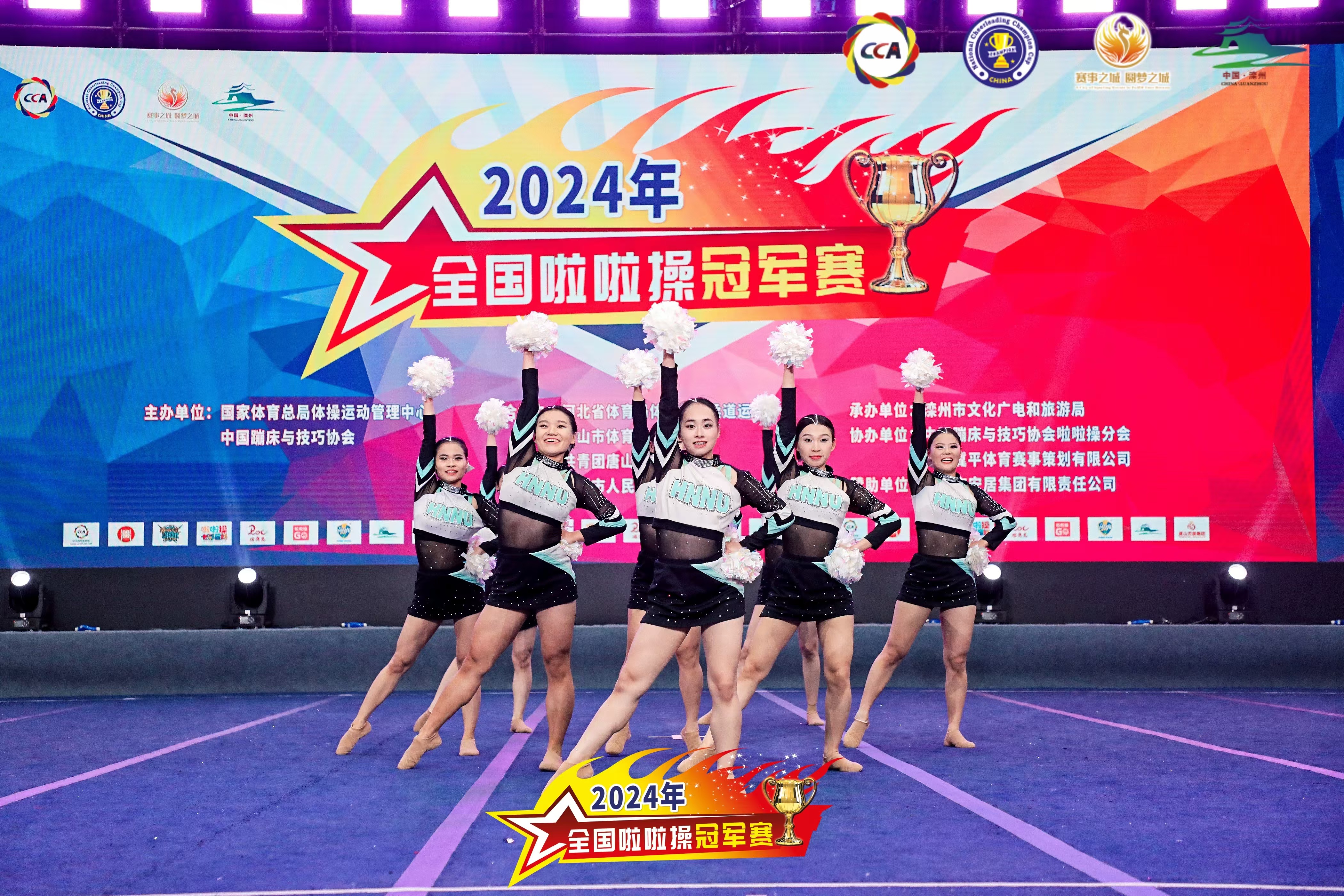 2024年全国啦啦操冠军赛由国家体育总局体操运动管理中心主办,河北省体育局、唐山市体育局、共青团唐山市委、栾州市人民政府共同承办。共有来自全国234支代表队4698名运动员参赛。我校代表队娄雯琼、付佳、朱小燕、张帆、张艳珂、刘梦琪、胡佳慧、赵楠楠获小集体花球2级规定动作冠军;娄雯琼、付佳、朱小燕、刘艺曦、代松、刘梦琪、胡佳慧、赵楠楠获小集体自由舞蹈冠军;娄雯琼、付佳、朱小燕、张帆、张艳珂、刘梦琪、胡佳慧、赵楠楠获小集体花球自选动作亚军;张帆、张艳珂获双人爵士自选动作亚军,刘艺曦、代松获·双人街舞自选第三名。