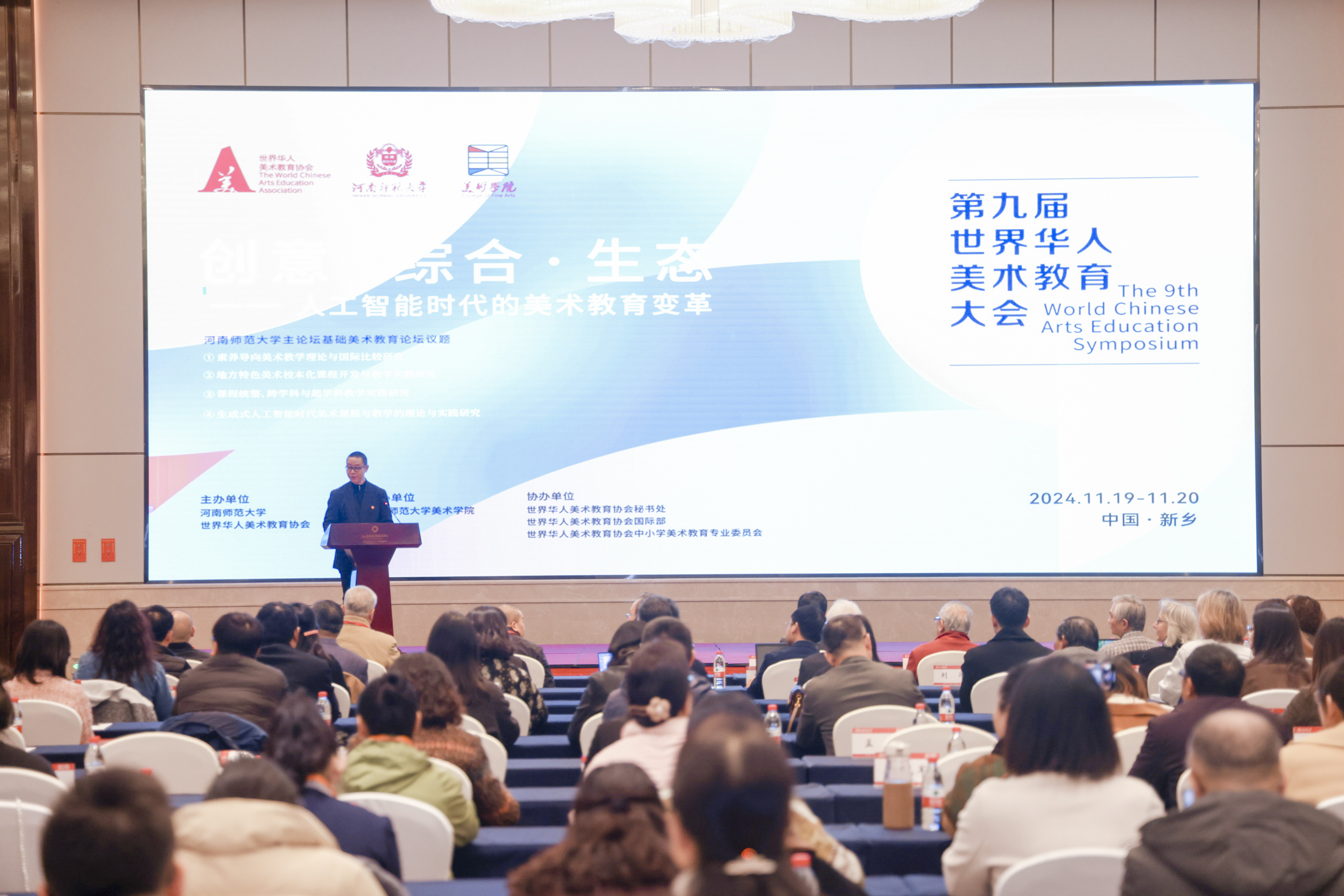 张幼云代表世界华人美术教育协会致辞。他表示,作为全球唯一的华人国际美术教育组织,在推动跨国学术交流和美术教育改革创新中发挥着重要作用,产生了深远的国际影响。美术教育应积极应对人工智能时代带来的机遇与挑战,本次大会将从不同视野和角度深入探讨人工智能时代的基础美术教育变革,寻求迎接时代挑战的有效对策。