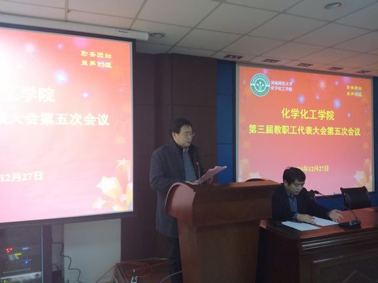 12月27日下午,化学化工学院第三届教职工代表大会第五次会议在学院北楼五楼会议室召开,学院党政领导、教职工代表共50人出席会议,会议由化学化工学院工会主席李朝阳主持。