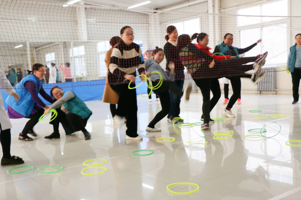 12月16日下午,校医院职工在三楼活动室举行了工会活动月的第二场趣味运动会。到场人员仍采取现场抓阄的方式,分成红黄蓝三队。比赛有“脚接套圈”、“反口令转身”、“萝卜蹲”、“比划猜词”四个集体项目。