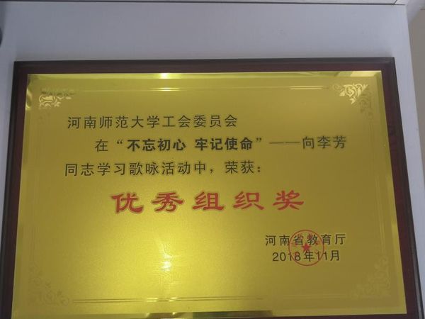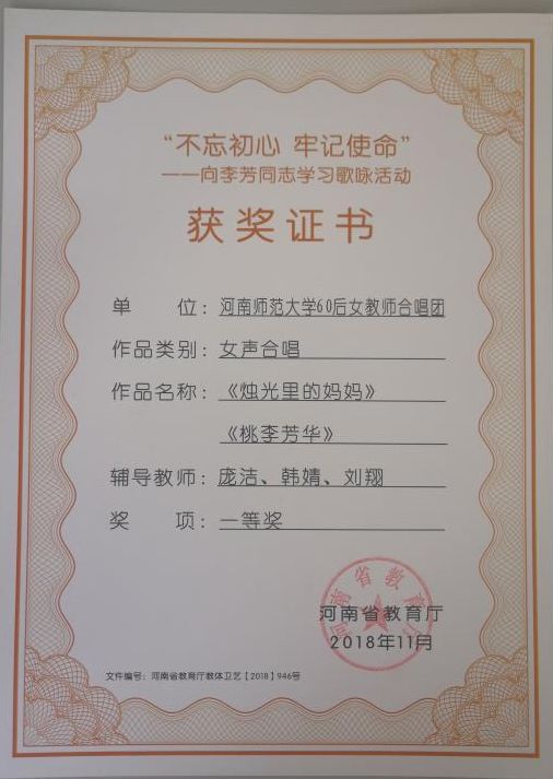 为充分发挥先进典型的精神感召力,进一步宣传李芳同志的先进事迹,日前,河南省教育厅发文表彰“不忘初心 牢记使命”向李芳同志学习歌咏活动获奖单位和个人,我校工会“60后女教师合唱团”获得比赛一等奖,伟德官网下载苹果版工会委员会获优秀组织奖,音乐舞蹈学院段续获艺术指导奖,庞洁、韩婧、刘翔获辅导教师奖,刘雨晴获优秀钢伴奖。