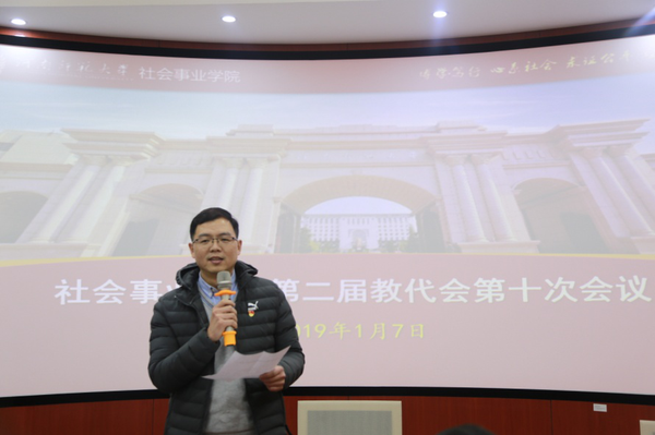 社会事业学院第二届教代会第十次会议,于2019年1月7日在学院五楼社会工作实训室进行。上午在学院301C召开了预备会,提出学院工会委员会委员调整方案,下午召开了正式会议,在召开此次会议之前,学院进行了提案征集。