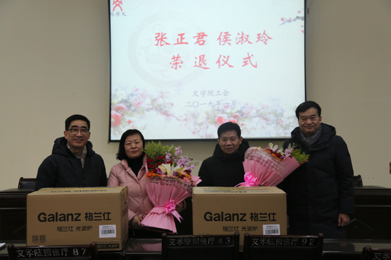 张正君、侯淑玲两位老师在学院默默耕耘了几十年,两位老师分别回顾了自己在学院工作的点滴。张正君老师表示,自己在学院工作了35年,早已把文学院当成了自己第二个家,虽然现在退休了但是只要学院有需要,自己会义不容辞的回到学院继续为学院贡献自己的力量。侯淑玲老师抒发了自己退休后的感想,说到自己1985年参加工作,2005年来到文学院,虽然工作的时间不长,但对学院充满了深厚的感情,并向广大教职工对自己多年来的支持和关照表示感谢。仪式上学院领导班子向两位老师赠送了纪念品,青年教师代表向两位老师敬献了鲜花。
