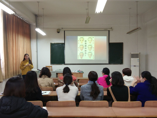 孙琳娜从人们最常见的肤色开始,讲述了肤色的种类以及由肤色选择合适颜色的服装、饰品等。接着,引入人们较关心的体态健康问题。指出日常生活中常见的几种不良体态以及由此给人们身体造成的不适,并指出原因,演示纠正方法。此次讲座是生活中人们较关心又较容易忽视的内容,孙琳娜讲解中穿插动作示范,整体氛围轻松愉快。教职工认真聆听,积极互动,适时做笔记,表现出较高的兴趣,为女教职工的个人形象,体态健康增添了新的知识。