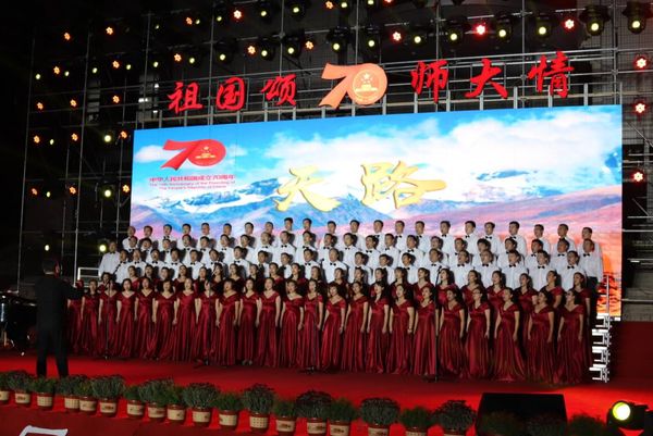 “那是一条神奇的天路,把人间的温暖送到边疆……”, 机关一总支合唱团以高昂嘹亮的歌声开始了歌曲《天路》的演唱。在音乐舞蹈学院院长段续的指挥和副院长谢世超钢琴伴奏的引领下,队员们的歌声时而慷慨激昂,时而温柔低吟,感情饱满,情绪昂扬,以幸福自豪的心情演绎出了藏家儿女为铁路修到家门口的欢欣鼓舞,传递了西藏人民渴望开通青藏铁路的愿望,表达了对伟大祖国的深情祝福和由衷赞美,并以铿锵有力的歌声高度赞扬新中国建设七十周年的辉煌成就。整场舞台演绎配合着现场灯光、指挥、伴奏、手势、高低音,将现场气氛推至高潮,赢得台下阵阵掌声。