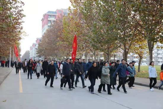 本次健步走活动沿东校区外围进行,全程约3.5公里。下午4点半,天气渐凉,早已做好准备的教职工轻装上阵、精神饱满。随着裁判员的发令枪响,大家迎着寒风、互相鼓励,迈开矫健的步伐,一路上欢声笑语不断,充分享受着锻炼带来的快乐与充实,用实际行动诠释着“健康生活,快乐工作”的理念。最终,所有教职工都按照规定路线,圆满完成了健步走任务,并领取了奖品。参与活动的教职工纷纷表示,经过体育锻炼精神状态更好了,今后将以更加积极的态度、饱满的热情投身到学校建设事业中去,为学校改革发展增光添彩、贡献力量。