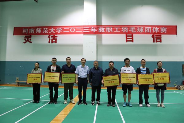 5月30日下午,由校工会主办,体育学院承办、校羽毛球协会协办的全校2023年教职工羽毛球团体赛在羽毛球馆落下帷幕。校党委常委、副校长聂国兴、体育学院相关负责人出席并为获得奖项的单位颁奖。闭幕式由校工会副主席王鹏祥主持。