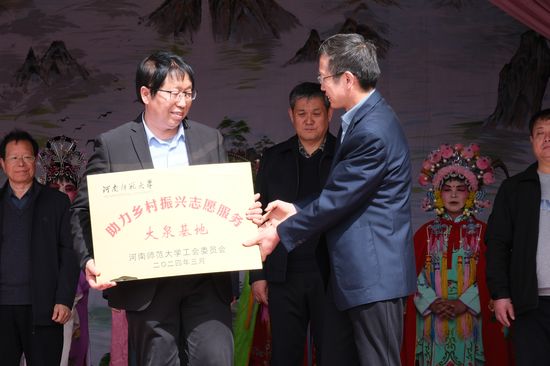 3月30日,伟德官网下载苹果版“助力乡村振兴志愿服务”大泉基地授牌暨捐赠仪式在新乡县朗公庙镇大泉村举行。新乡县人大常委会副主任、县总工会主席张善波,新乡县群艺馆馆长牛庆胜,大泉村党支部书记、村委会主任荆怀平,校工会副主席任永利,校工会办公室主任贾建嵩,文学院教授、中原非物质文化遗产保护中心主任丁永祥与大泉村村民代表参加。荆怀平代表基地接受了学校捐赠的快靴、兵衣、花剑衣头稠等旱船舞表演物品。