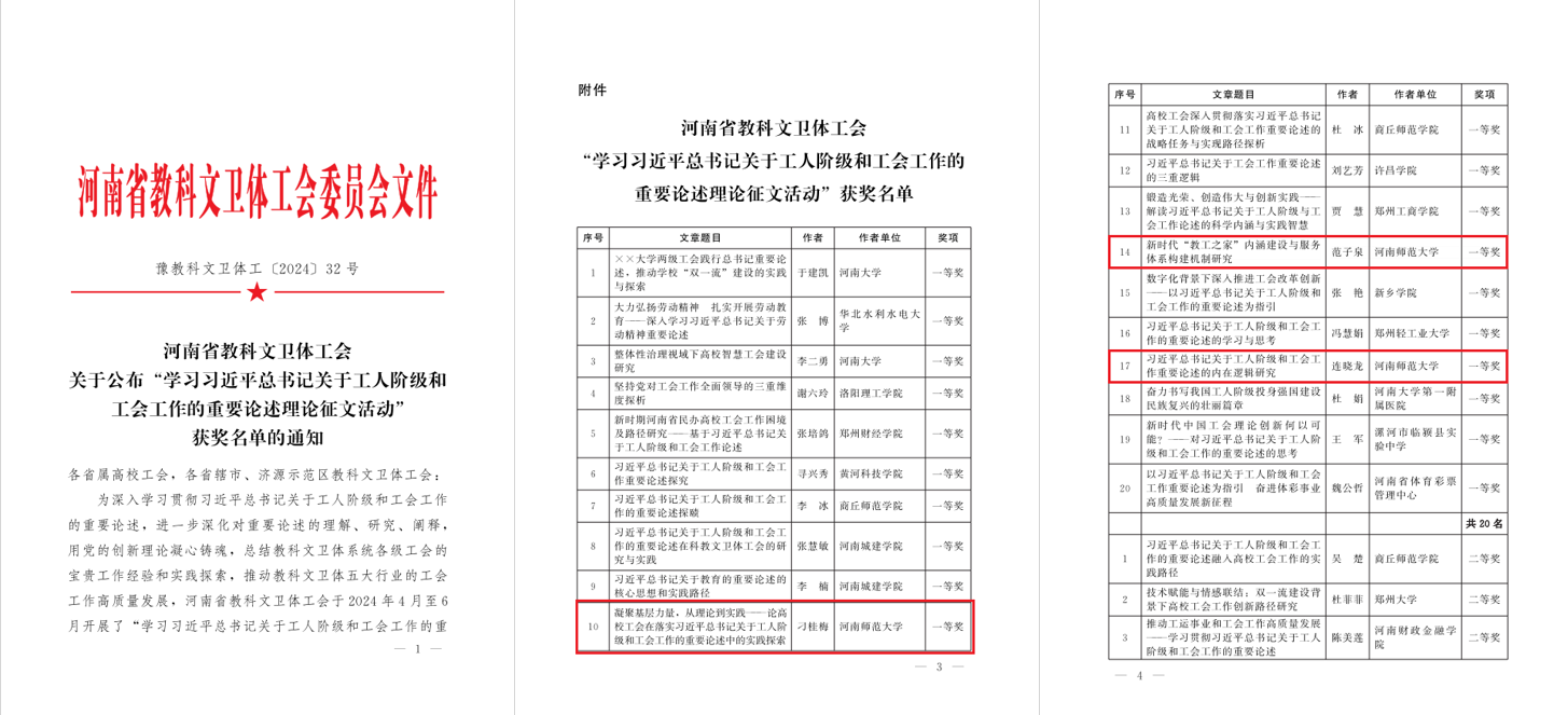 近日,河南省教科文卫体工会公布了“学习习近平总书记关于工人阶级和工会工作的重要论述理论征文活动”获奖名单,我校多位教师获奖。