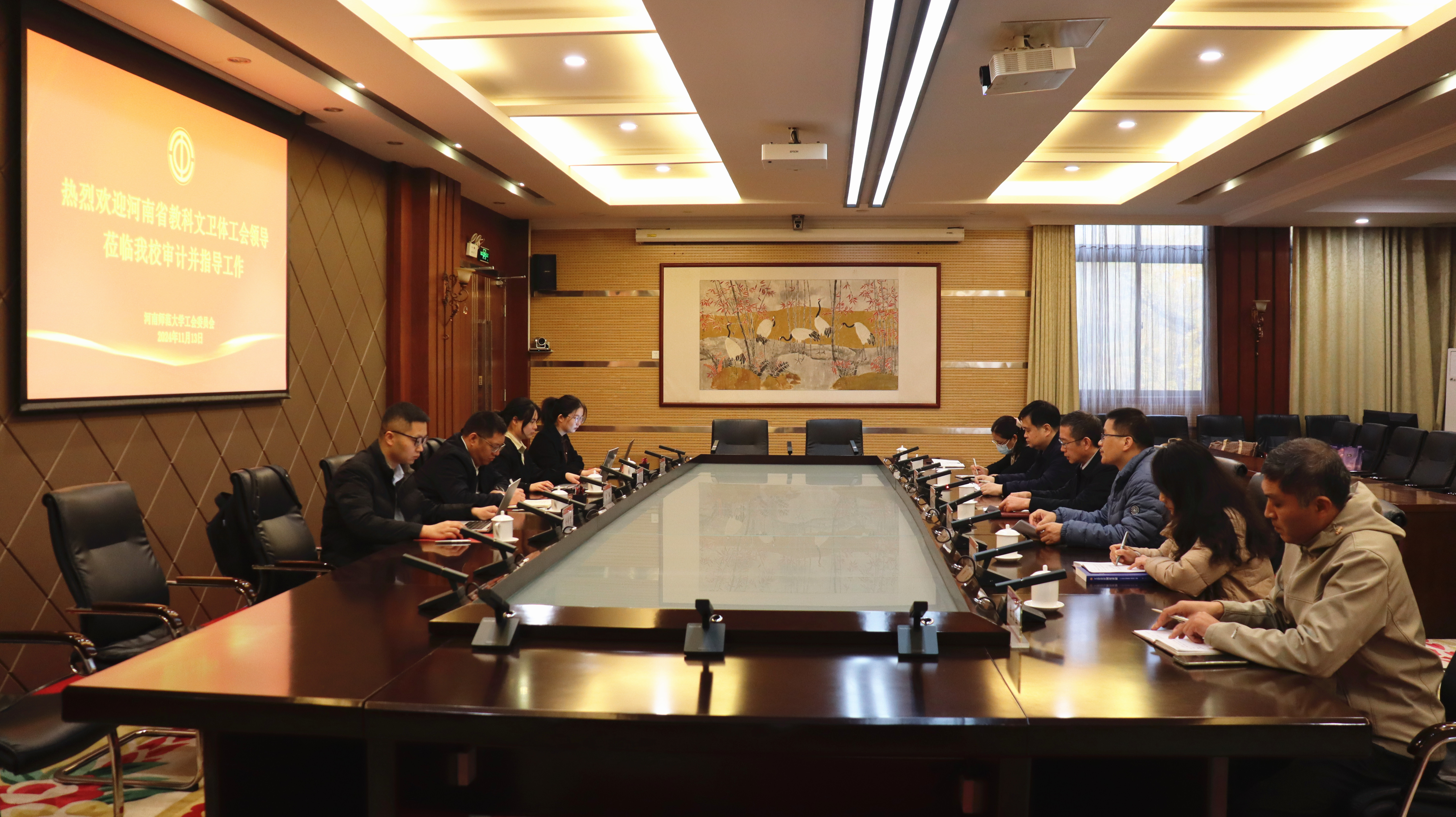 11月13日,河南省教科文卫体工会审计组一行在副主席、经审委主任李军带领下莅临我校,对2022、2023年度的工会经费预算执行情况进行审计。审计工作见面会在勤政楼第三会议室进行,审计组全体成员,校工会副主席任永利、王毅,财务处副处长周其锋、校工会办公室主任贾建嵩、工会会计赵杰、校工会全体工作人员参加。