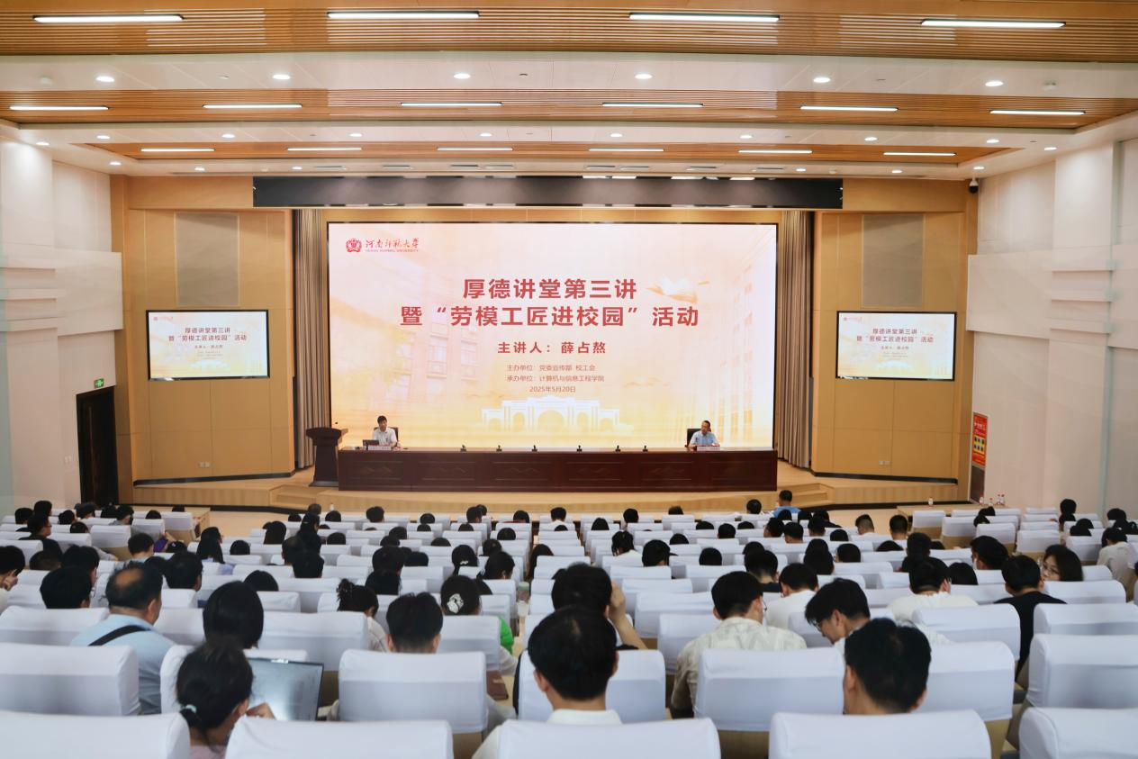 5月20日下午,我校“厚德讲堂”第三讲暨2025年“劳模工匠进校园”活动在求真楼五楼西报告厅举行。本期讲堂邀请计算机与信息工程学院薛占熬教授做专题报告,校党委宣传部副部长冀虹飞,校工会副主席、女工委主任王毅校工会办公室主任贾建嵩,各学院(部)、书院师生代表近300人参加。活动由校工会副主席任永利主持。